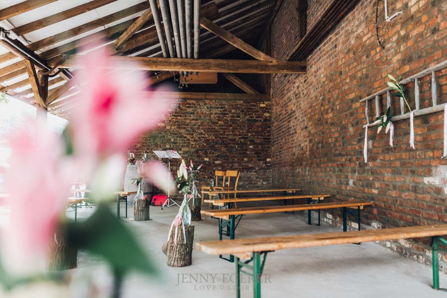 Der Innenhof des Gut Rehbach eignet sich ideal fuer einen Sektempfang. Dazu gibts ein paar Gedanken warum es sich aus meiner Sicht auch bei einer kleinen Feier lohnt eine Hochzeitsreportage zu buchen. Der alte Schuppen des Gut Hermeshof bietet Platz fuer eine Trauung im Freien.